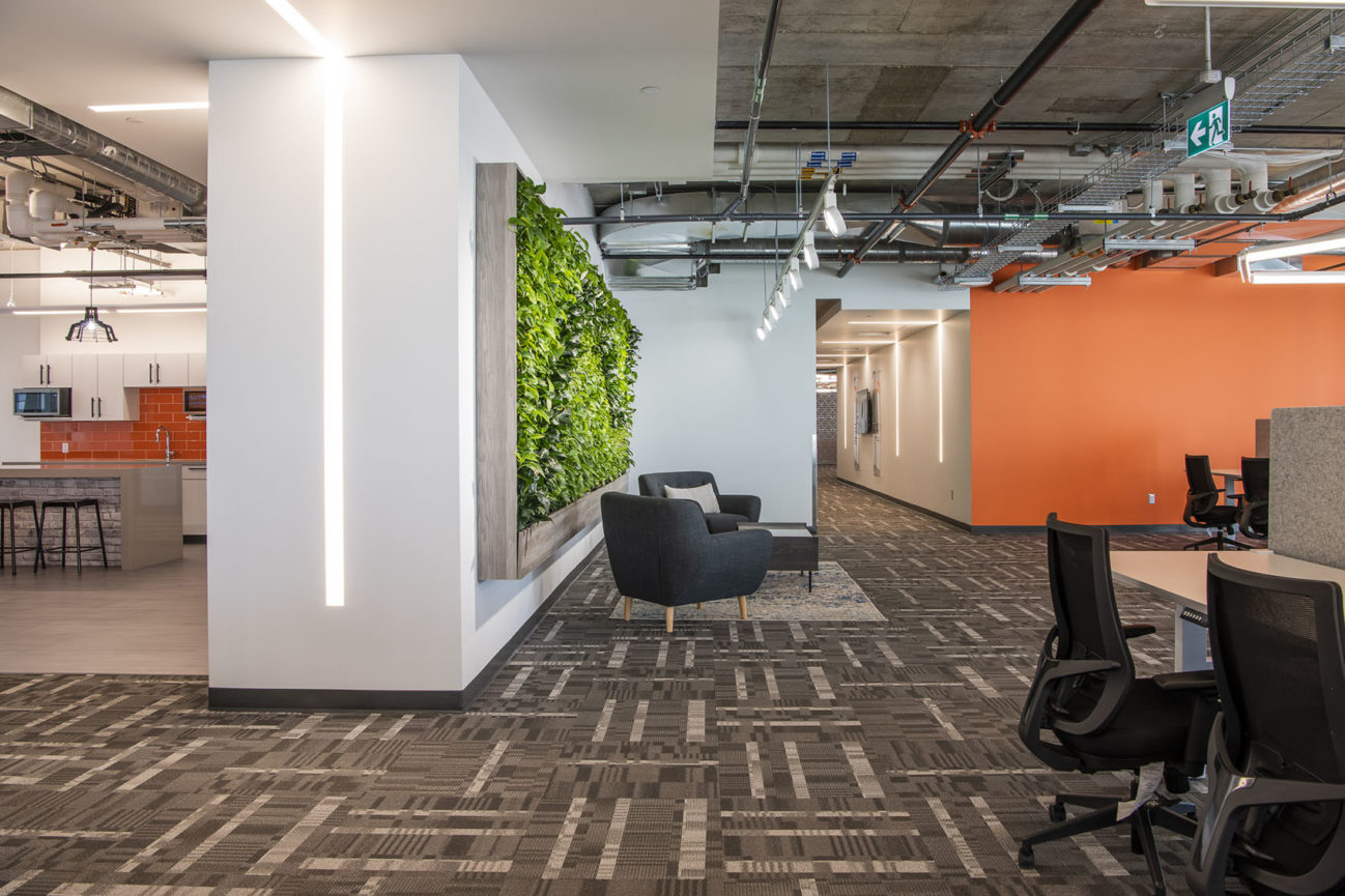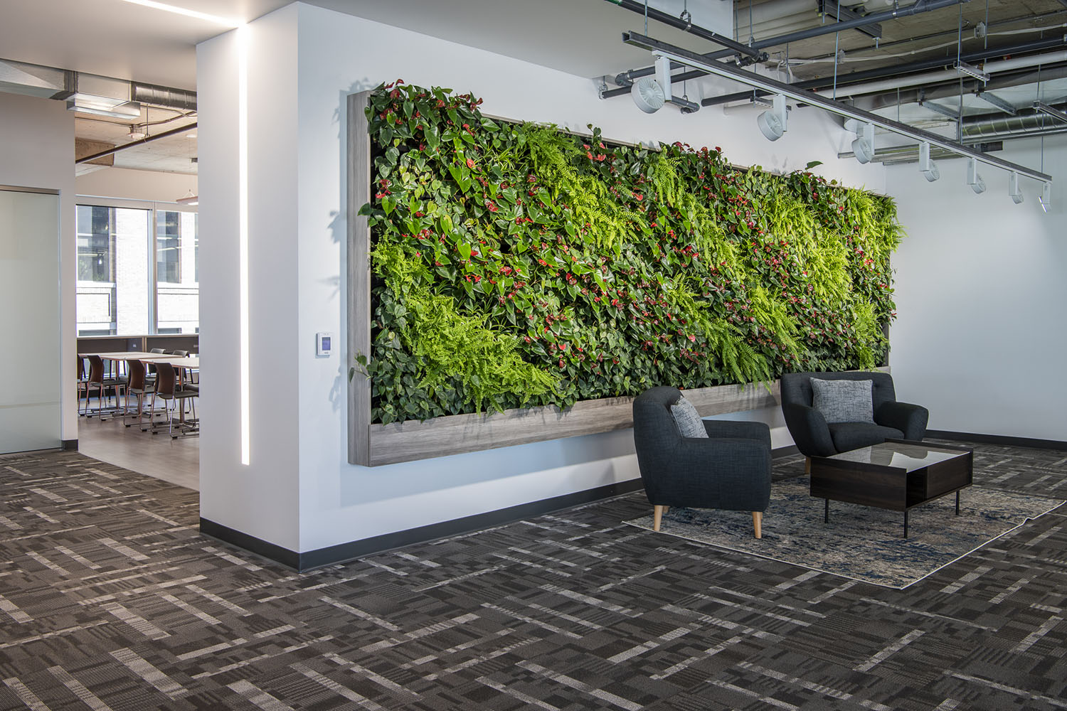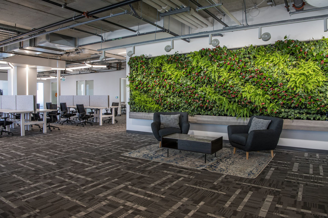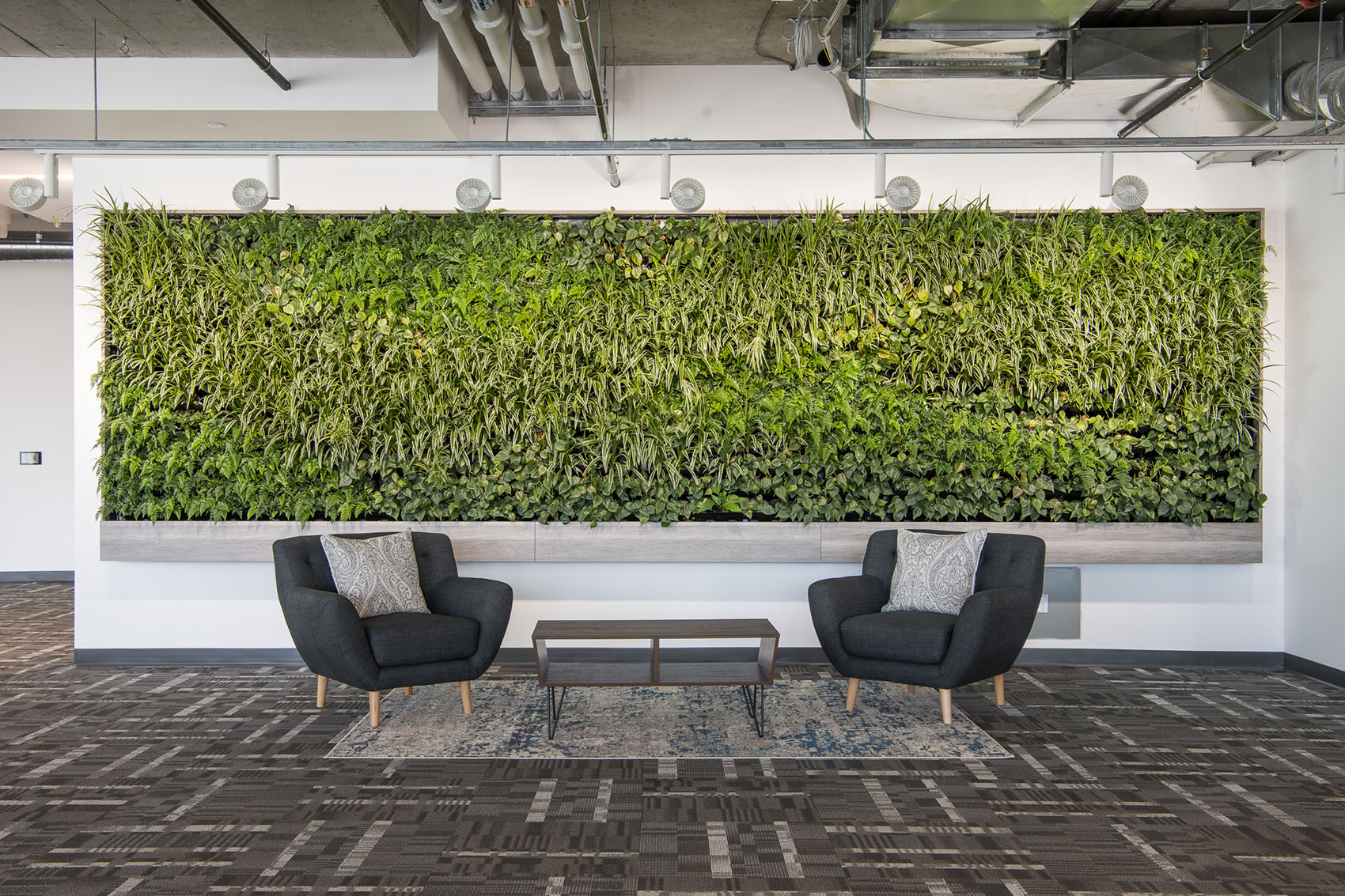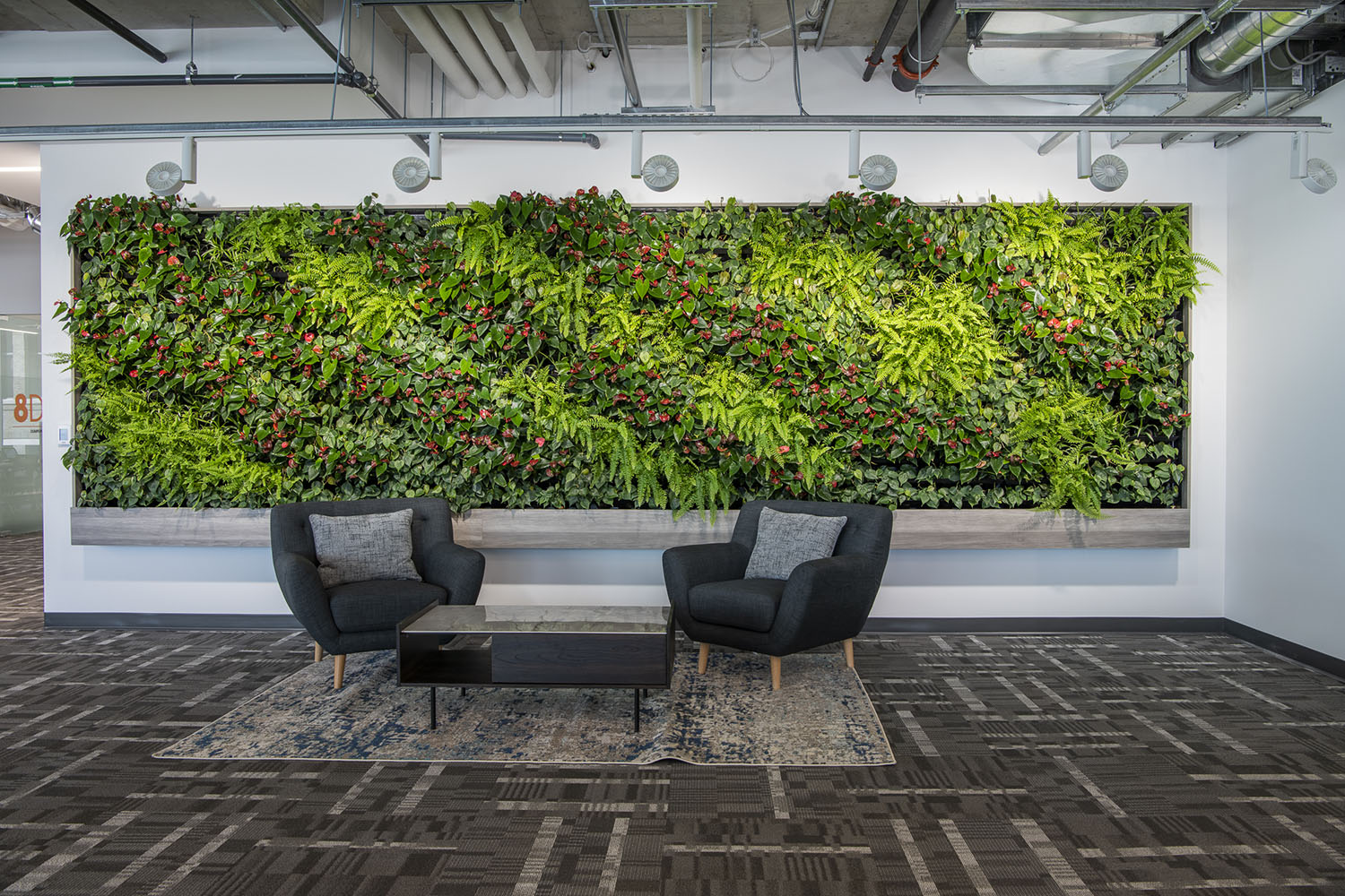 4 x Versa Walls featured on 4 floors. Each wall is 126 sqft. For a total of 504 sqft. and features 714 plants per wall, for a total of 2,856 plants. There are 8 different species of plants throughout the walls, each designed to create a unique theme for each floor. Designed, installed and maintained by Off the Wall Greenscapes. Photos by Ingrid Misner, Ingrid Misner Photography. 9 month follow up photos by Off the Wall Greenscapes.