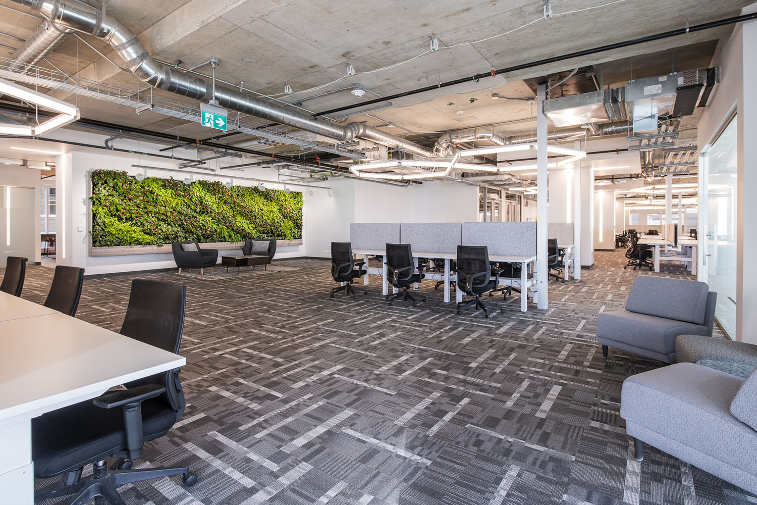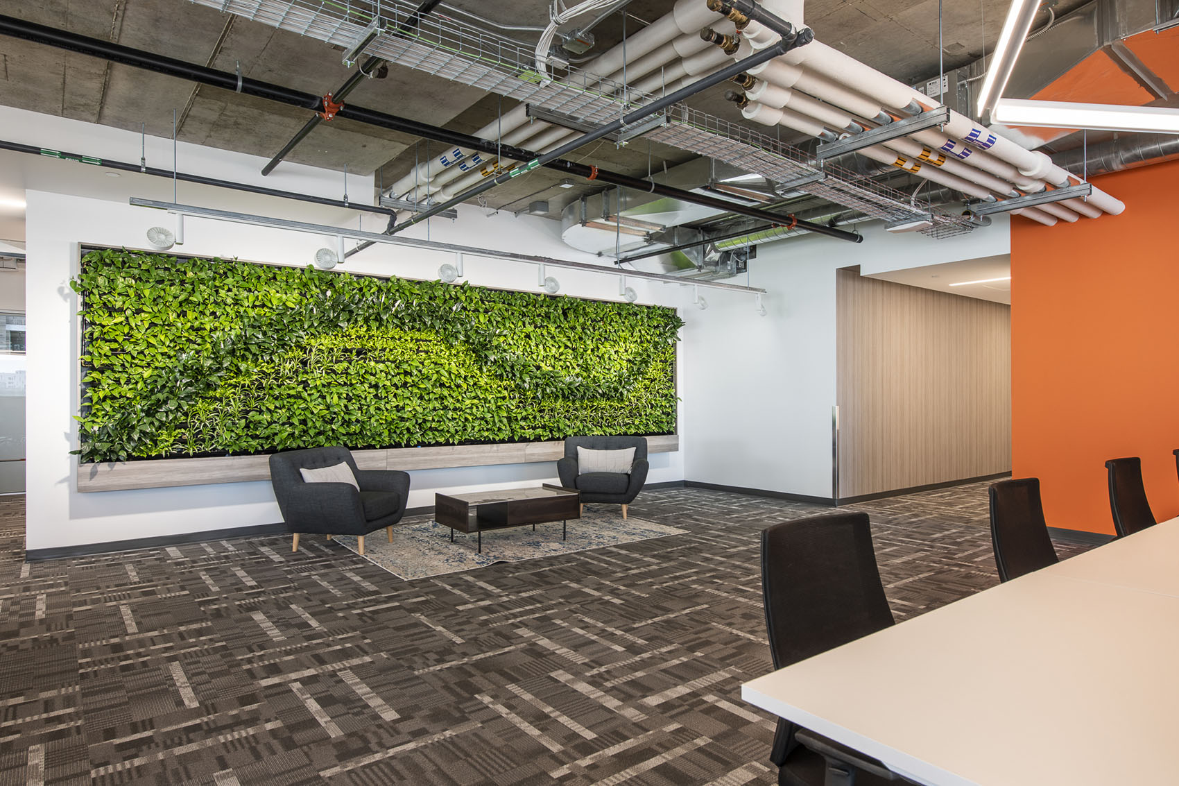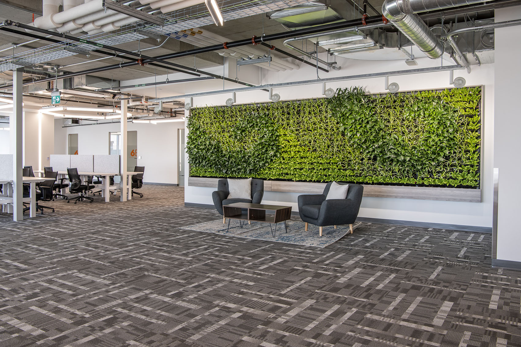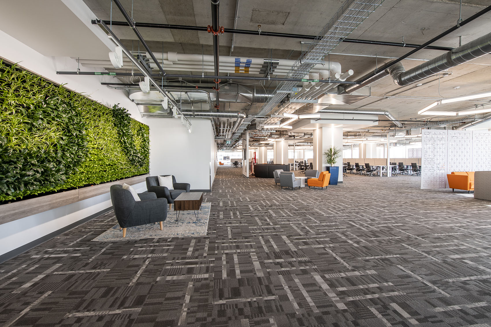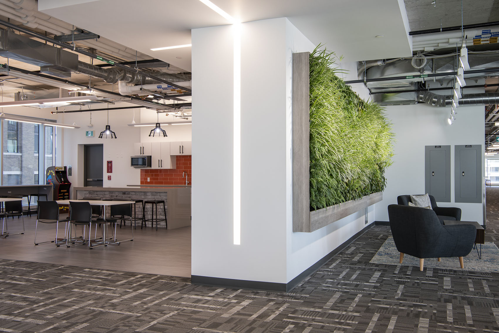 4 x Versa Walls featured on 4 floors. Each wall is 126 sqft. For a total of 504 sqft. and features 714 plants per wall, for a total of 2,856 plants. There are 8 different species of plants throughout the walls, each designed to create a unique theme for each floor. Designed, installed and maintained by Off the Wall Greenscapes. Photos by Ingrid Misner, Ingrid Misner Photography. 9 month follow up photos by Off the Wall Greenscapes.
