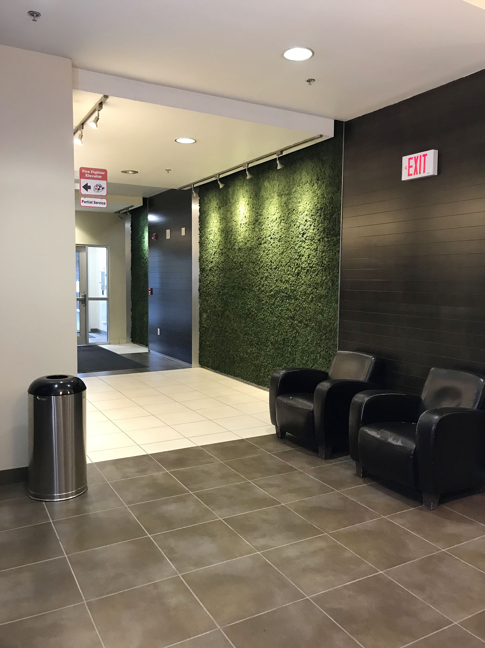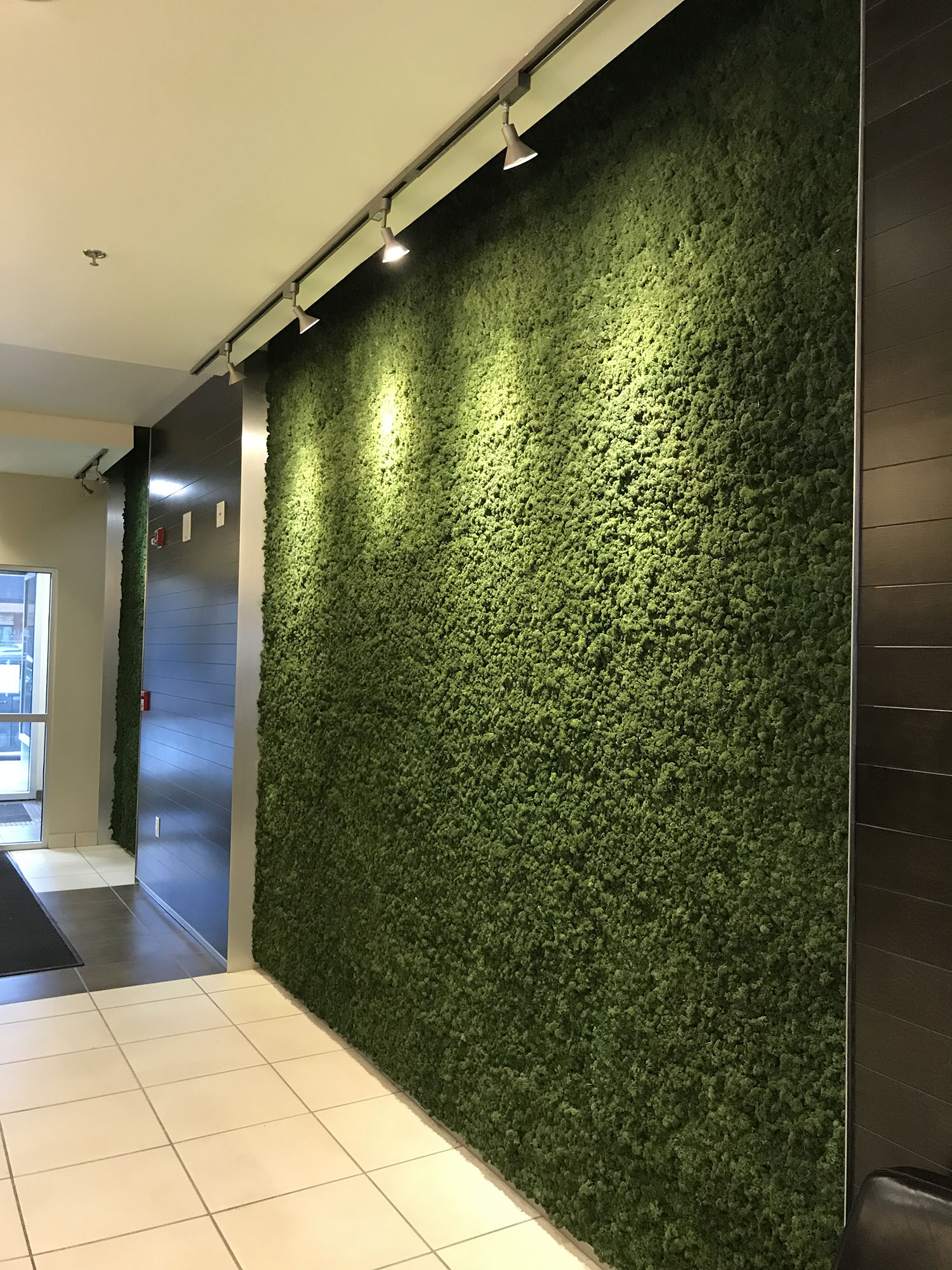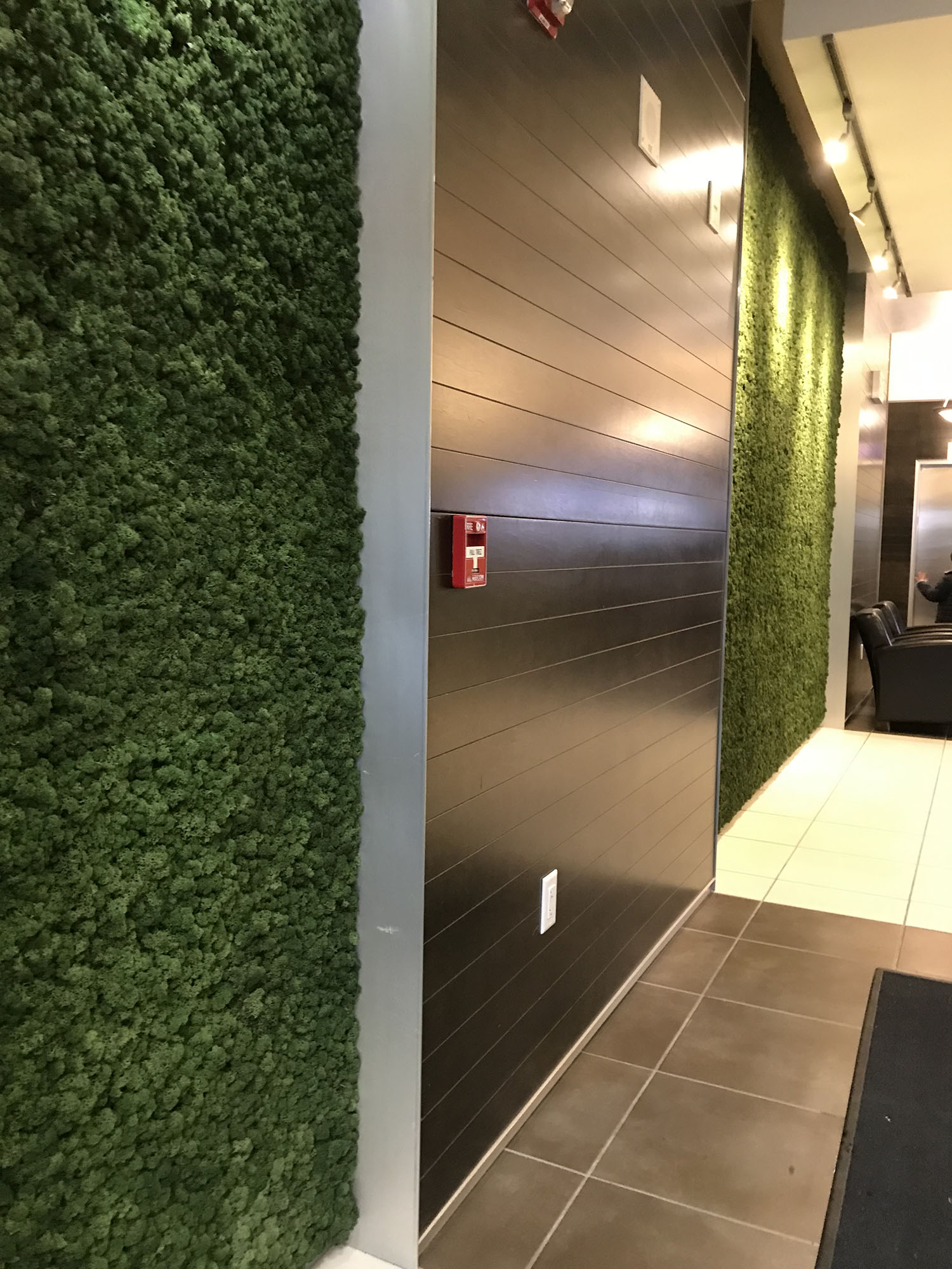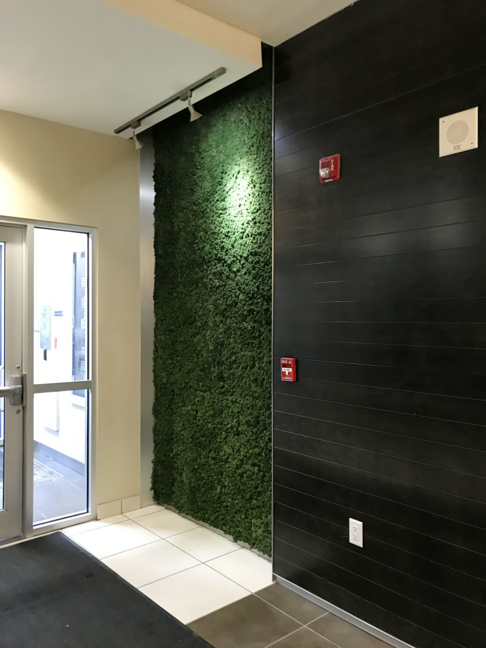 Wall 1 – 120 sqft.  Wall 2 – 50 sqft. In entry way lobby of condominium. Dark green reindeer moss. Designed and installed by Off the Wall Greenscapes.  Created by ByNature Design.