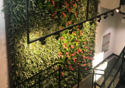 Interior plants need an even flood of 150 fc / 1500 lux of light provided across the entire surface of the wall for a min. of 10-12 hours per day with a colour temperature of 4000 to 4500° K. It is recommended that either Metal Halide or LEDs be used.